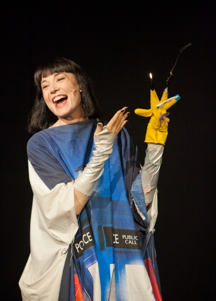 Now let’s take a look at the show itself. I’ll Be Bec has a rather fun central premise: what if somebody visited the future and it was just weird? Well Bec Hill has done that, in her time travelling gear (a Doctor Who poncho as a protective suit and a cardboard Becks beer crate as a helmet) and with a little help from some backstage special effects and whizzbangery. Bec includes the audience from the very beginning, offering them the chance to ask some questions about what she has seen in the far flung future before launching into one of her absolute best routines, the giant flip books.